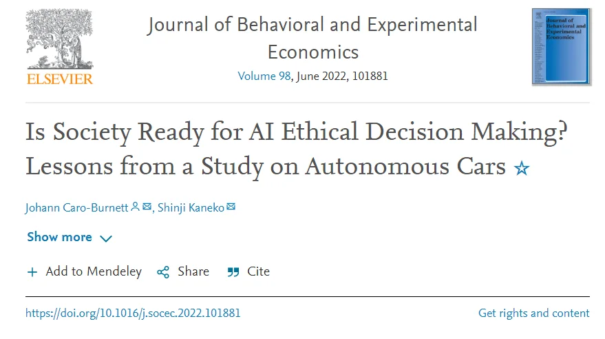 近日,一個(gè)來自廣島大學(xué)的研究小組探究了人類對(duì)引入人工智能決策的反應(yīng)。具體來說,他們通過研究人類與自動(dòng)駕駛汽車的互動(dòng),探討了一個(gè)問題:“社會(huì)準(zhǔn)備好接受人工智能道德決策了嗎?”